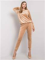 Beżowy welurowy komplet dwuczęściowy Kimberly to idealny element odzieżowy na każdą okazję. Bluzę i spodnie ozdobione są praktycznymi kieszeniami. Wykonany z miękkiego połączenia bawełny (95%) i lycry (5%), wymaga jedynie prania w pralce w 40°C. Ten elegancki komplet w rozmiarze S/M ma wymiary mierzone na płasko: 59 cm szerokości pod pachami, 62 cm długości rękawa, 64 cm długości bluzy, 34 cm szerokości w pasie i 102 cm długości spodni. Uzupełnij swoją stylizację o ten modny zestaw.