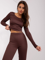 Ten komplet składa się z bluzki i spodni. Wszystko jest gładkie, a szerokie nogawki oraz wysoki stan spodni zapewniają komfort podczas użytkowania. Bluzka ma okrągły dekolt i długie rękawy – idealne rozwiązania dla chłodniejszych dni.
