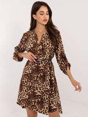 Ecru-pomarańczowa sukienka z printami i paskiem