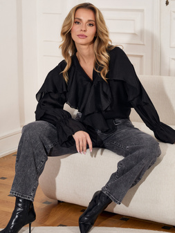 Czarna elegancka koszula damska z falbankami przy rękawach RUE PARIS